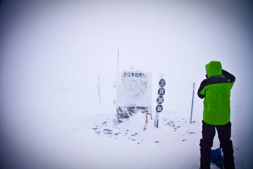 写真は山頂で記念撮影中のところ。この時点ですでに20m先は視認不可。
